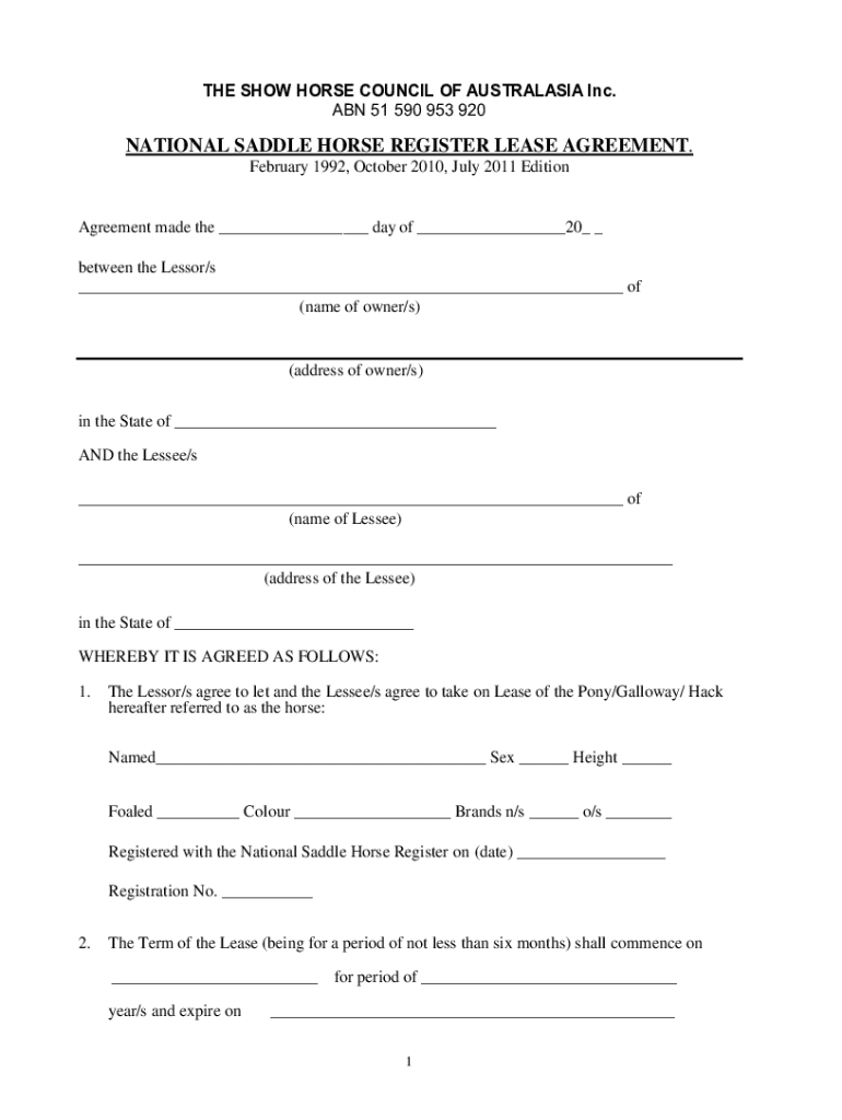 This lease agreement outlines the terms between lessor and lessee for saddle horse leasing, including responsibilities, terms, and conditions, as per The Show Horse Council of Australasia.