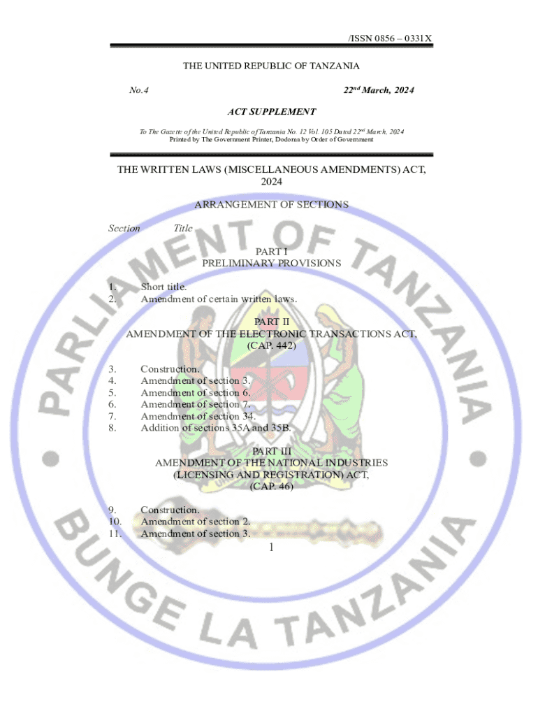 Explore the provisions of the Written Laws (Miscellaneous Amendments) Act of 2024, which focuses on amending key legislations in Tanzania, enhancing regulatory frameworks for electronic transactions and industries.