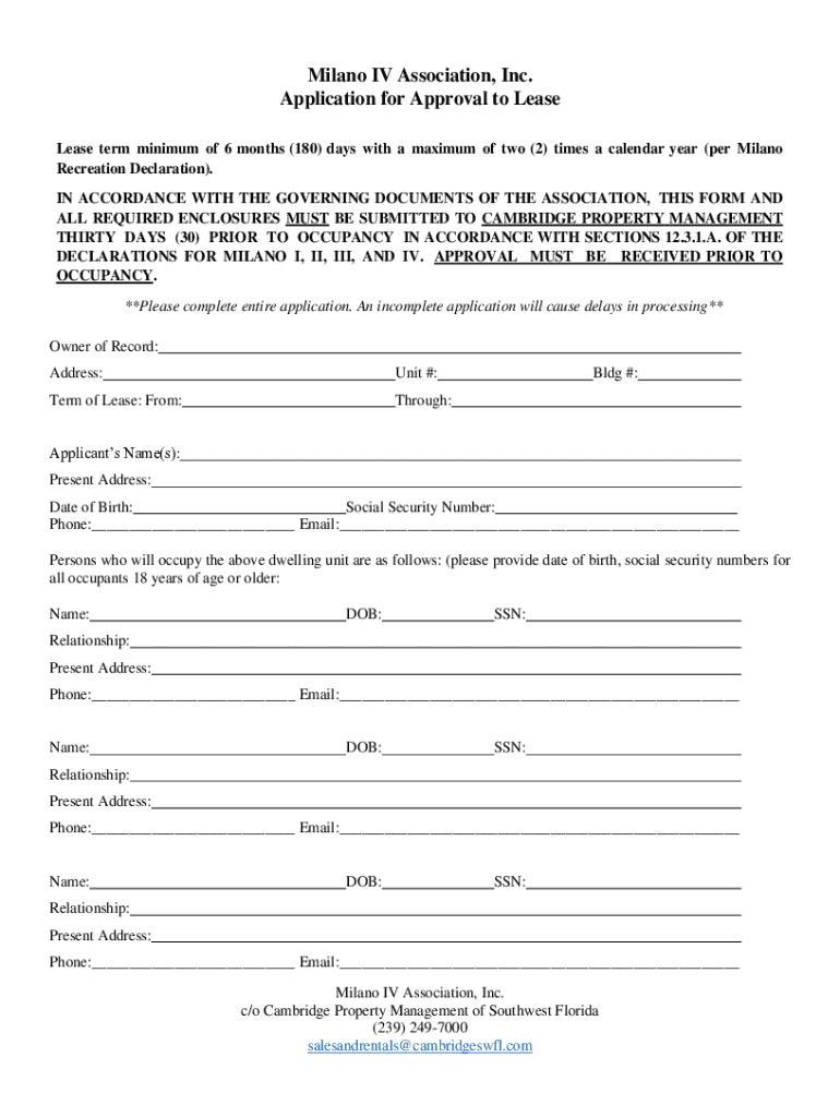 Submit your application for lease approval with Milano IV Association. Ensure compliance with the lease term and occupancy requirements to avoid delays.