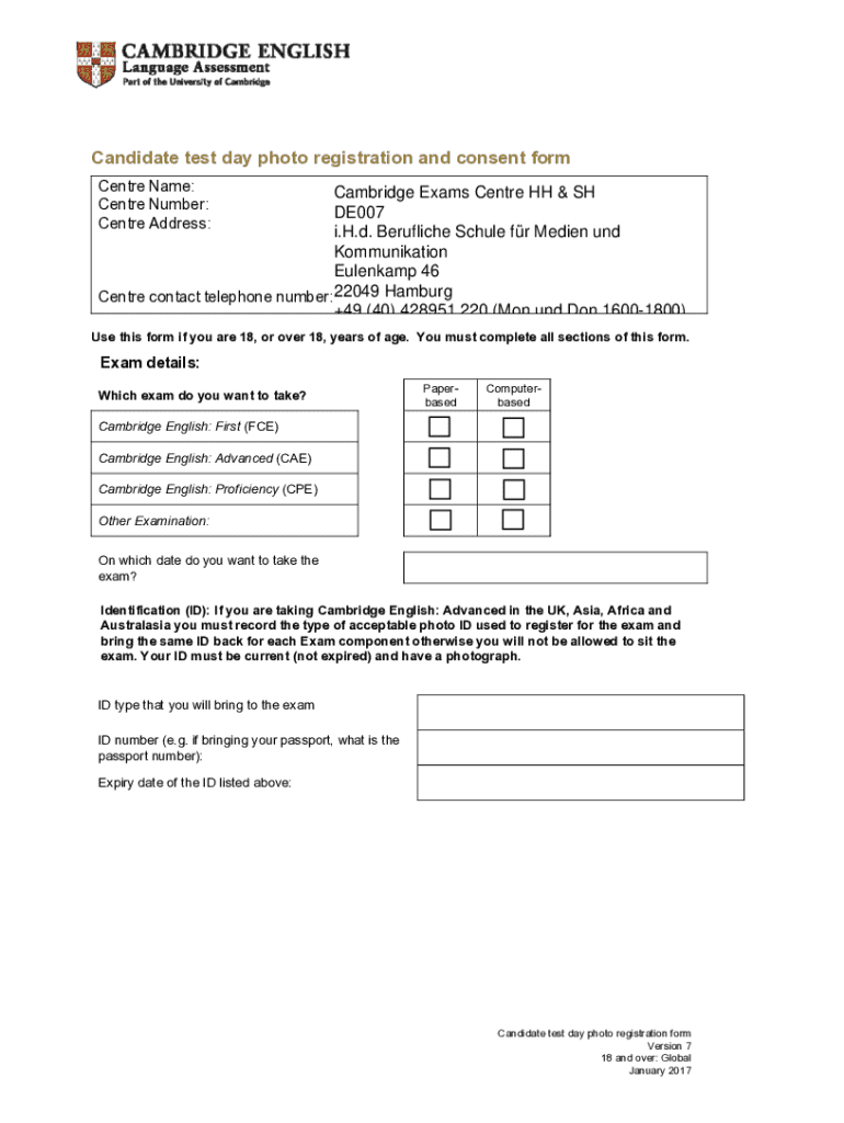 Complete this form to register for Cambridge English exams. Ensure your ID meets requirements for participation. Consent for photo on exam day.