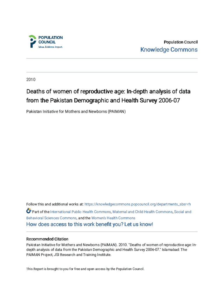 Population CouncilKnowledge Commons2010Deaths of women of reproductive age: Indepth analysis of data from the Pakistan Demographic and Health Survey 200607 Pakistan Initiative for Mothers and Newborns (PAIMAN)Follow this and additional works at: https://knowledgecommons.popcouncil.org/departments_sbsrrh Part of the International Public Health Commons, Maternal and Child Health Commons, Social and Behavioral Sciences Commons, and the Women\'s Health CommonsHow does access to this work