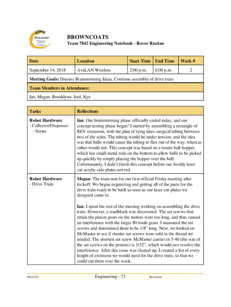 Team 7842 Engineering Notebook Rover RuckusDateLocationStart Timed Time September 14, 2018AvaLAN Wireless2:00 p.m.6:00 p.m. Week #