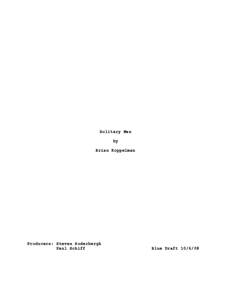 Solitary Man by Brian KoppelmanProducers: Steven Soderbergh Paul SchiffBlue Draft 10/6/08OPEN IN: 1INT. NEW YORK APARTMENT MORNING Spacious.Modernist furniture.1Some black lacquer.A mans voice is heard. From his tone, we can tell hes used to people listening when he speaks. BEN (V.O.) The day I turned thirteen... TRACK into... 2INT. BEDROOM NEW YORK APARTMENT MORNING2BEN KALMAN sleeps. BEN (V.O.) ...Actually, it was the night I turned thirteen, after the party and the envelopes and speeches...