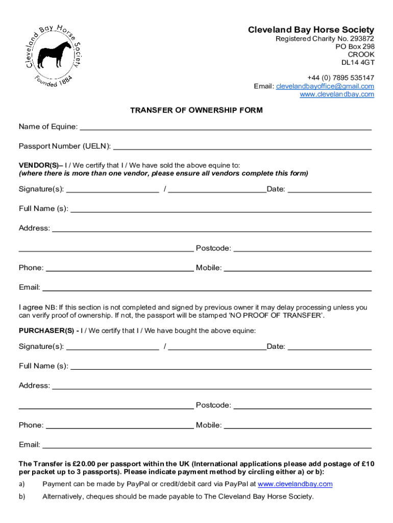 To fill out the Cleveland Bay Horse Society forms, individuals should provide required information such as the horse's registration details, owner information, and any relevant breeding or showing records.