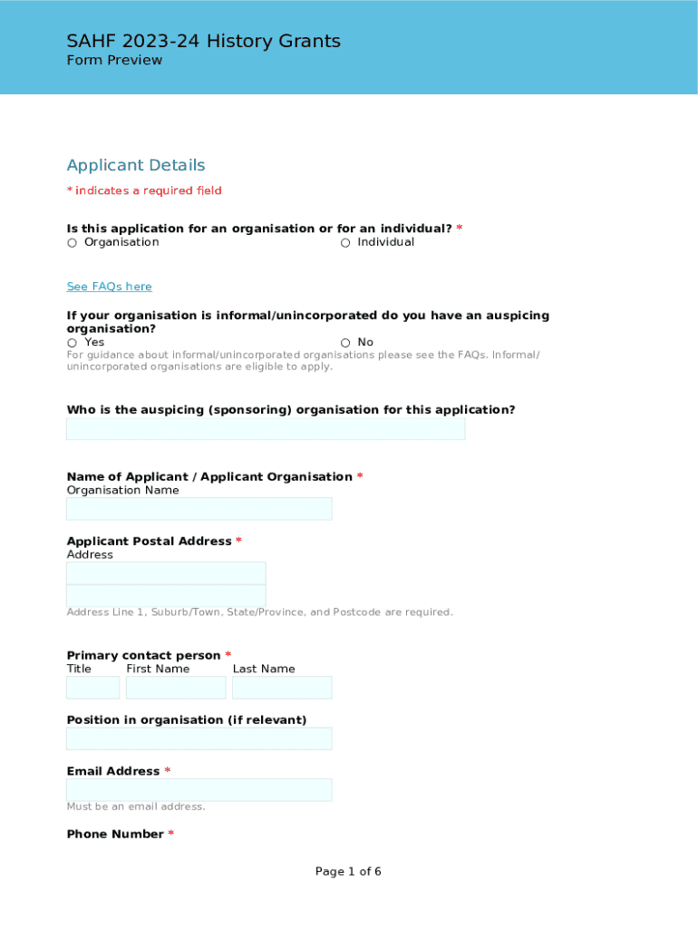 SAHF 202324 History Grants Form PreviewApplicant Details * indicates a required eld Is this application for an organisation or for an individual? * Organisation Individual See FAQs here If your organisation