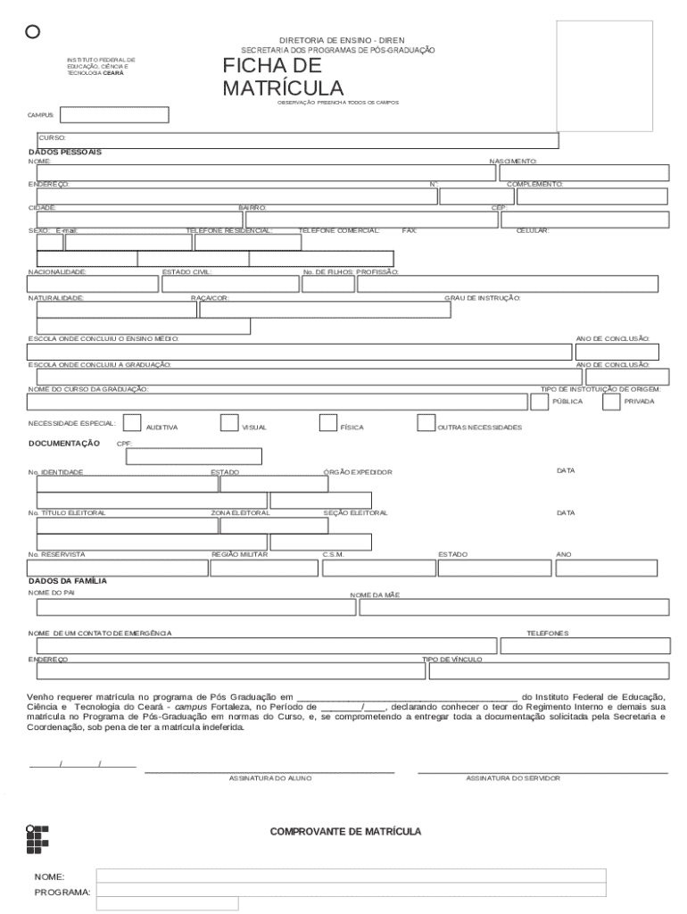 The ficha de matricula - superior is a document that has to be filled-out and signed for specified purpose. In that case, it is furnished to the actual addressee in order to provide some details of any kinds. The completion and signing is available or with an appropriate service e. g. PDFfiller. These tools help to complete any PDF or Word file online. It also allows you to customize its appearance for your requirements and put a legal digital signature. Once you're good, the user ought to send the ficha de matricula - superior to the respective recipient or several ones by mail and even fax. PDFfiller is known for a feature and options that make your Word template printable. It includes different options for printing out appearance. It does no matter how you will file a form - in hard copy or by email - it will always look neat and organized. In order not to create a new document from scratch all the time, turn the original file into a template. After that, you will have an editable sample.