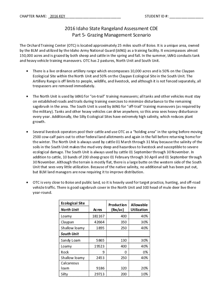 CHAPTER NAME: _2016 KEY___STUDENT ID #: ___2016 Idaho State Rangeland Assessment CDE Part 5 Grazing Management Scenario The Orchard Training Center (OTC) is located approximately 25 miles south of