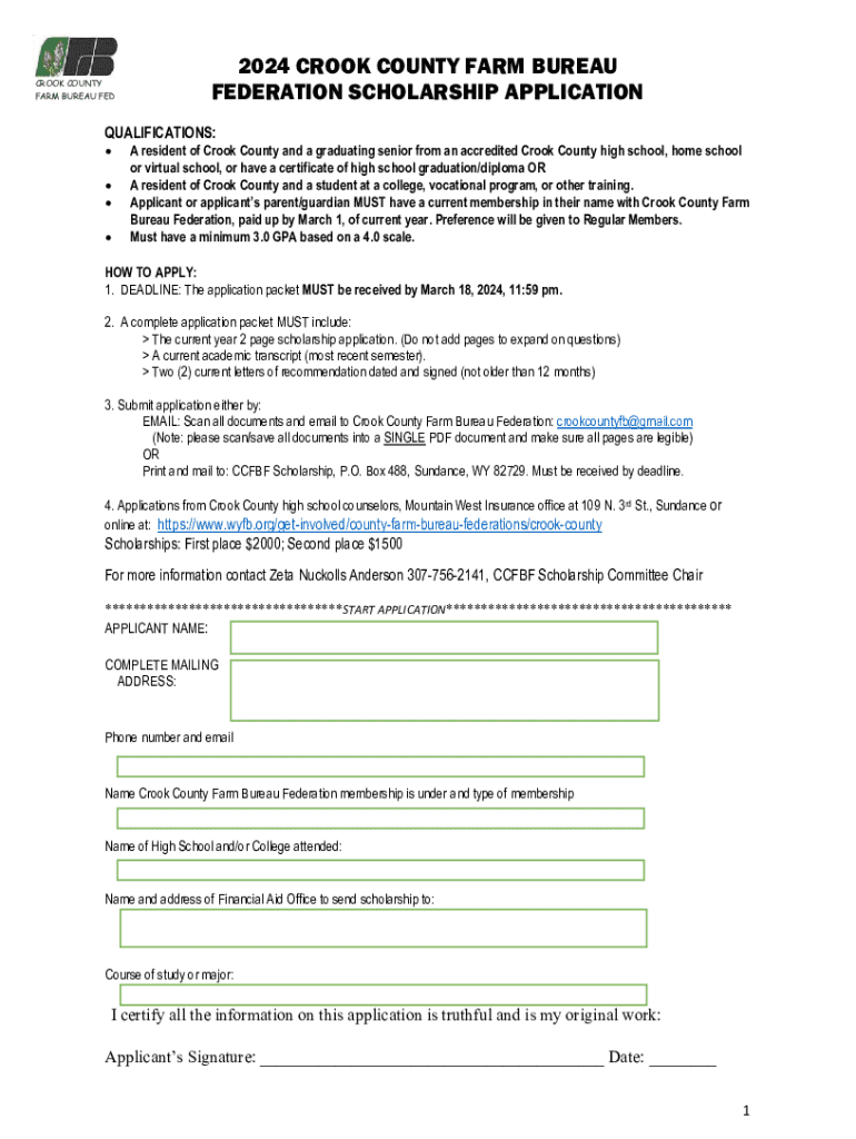 CROOK COUNTY FARM BUREAU FED2024 CROOK COUNTY FARM BUREAU FEDERATION SCHOLARSHIP APPLICATIONQUALIFICATIONS: A resident of Crook County and a graduating senior from an accredited Crook County high