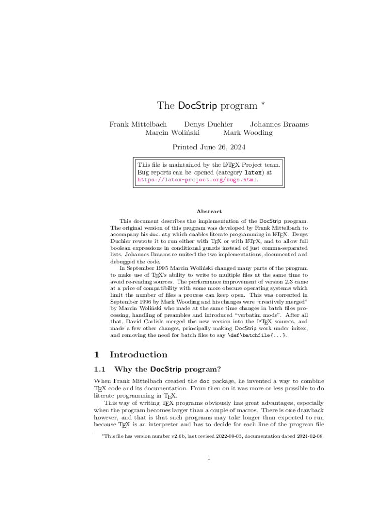 The DocStrip programFrank Mittelbach Denys Duchier Johannes Braams Marcin Wolinski Mark Wooding Printed June 26, 2024 This file is maintained by the LATEX Project team. Bug reports can be opened (category latex) at https://latexproject.org/bugs.html.Abstract This document describes the implementation of the DocStrip program. The original version of this program was developed by Frank Mittelbach to accompany his doc.sty which enables literate programming in LATEX. Denys Duchier rewrote