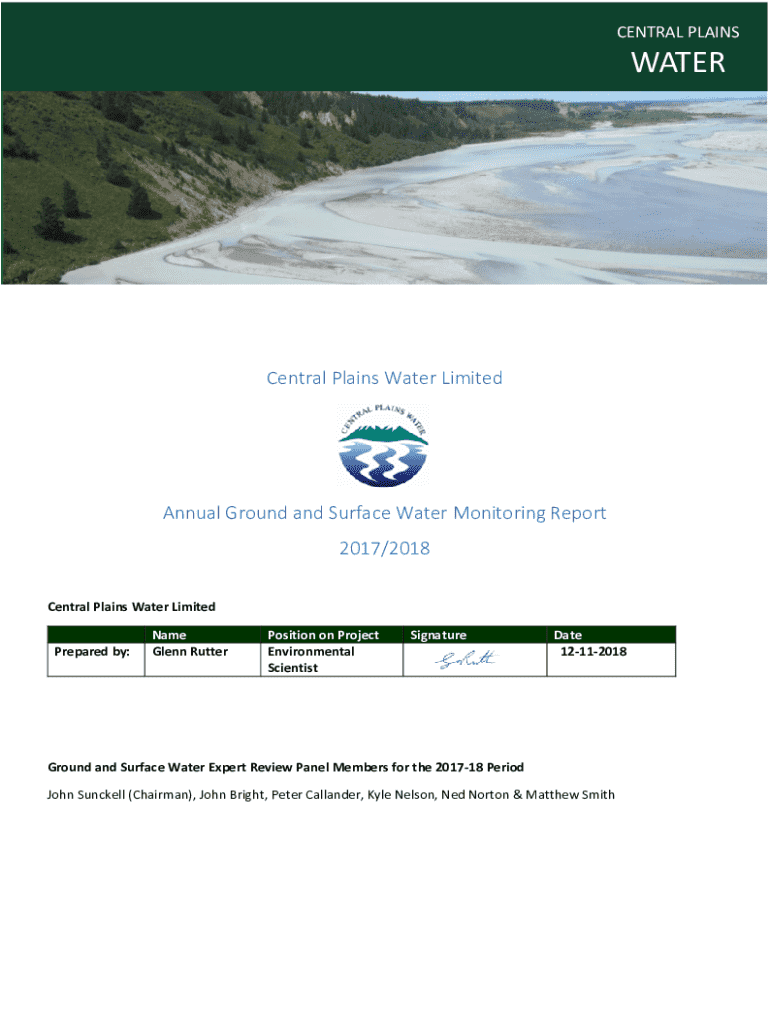 CENTRAL PLAINSWATERCentral Plains Water LimitedAnnual Ground and Surface Water Monitoring Report 2017/2018 Central Plains Water Limited Prepared by:Name Glenn RutterPosition on Project Environmental ScientistSignatureDate 12112018Ground and Surface Water Expert Review Panel Members for the 201718 Period John Sunckell (Chairman), John Bright, Peter Callander, Kyle Nelson, Ned Norton & Matthew SmithTable of Contents 1.Purpose ................................................