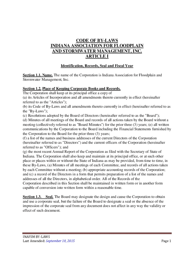 CODE OF BYLAWS INDIANA ASSOCIATION FOR FLOODPLAIN AND STORMWATER MANAGEMENT, INC. ARTICLE I Identification, Records, Seal and Fiscal Year Section 1.1. Name. The name of the Corporation is Indiana
