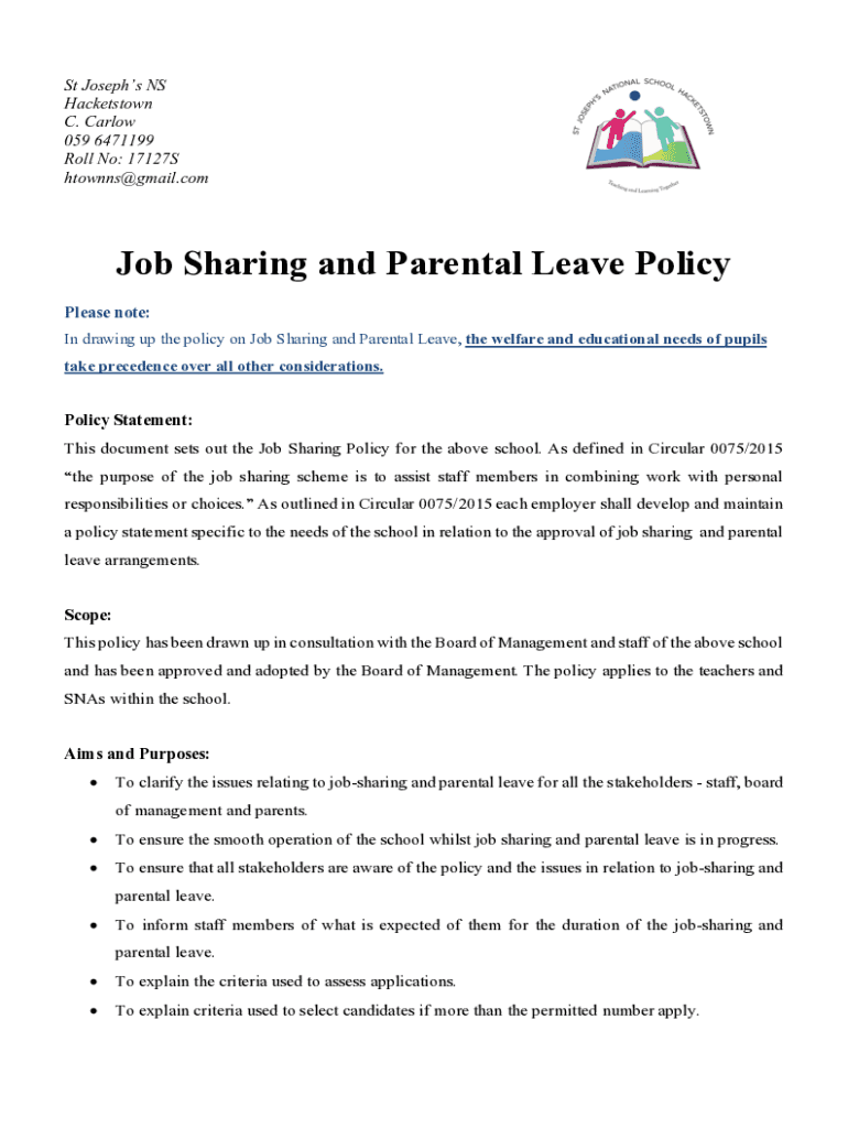 This policy outlines the guidelines for job sharing and parental leave at St Joseph’s NS, ensuring compliance with DES Circulars and addressing staff responsibilities.