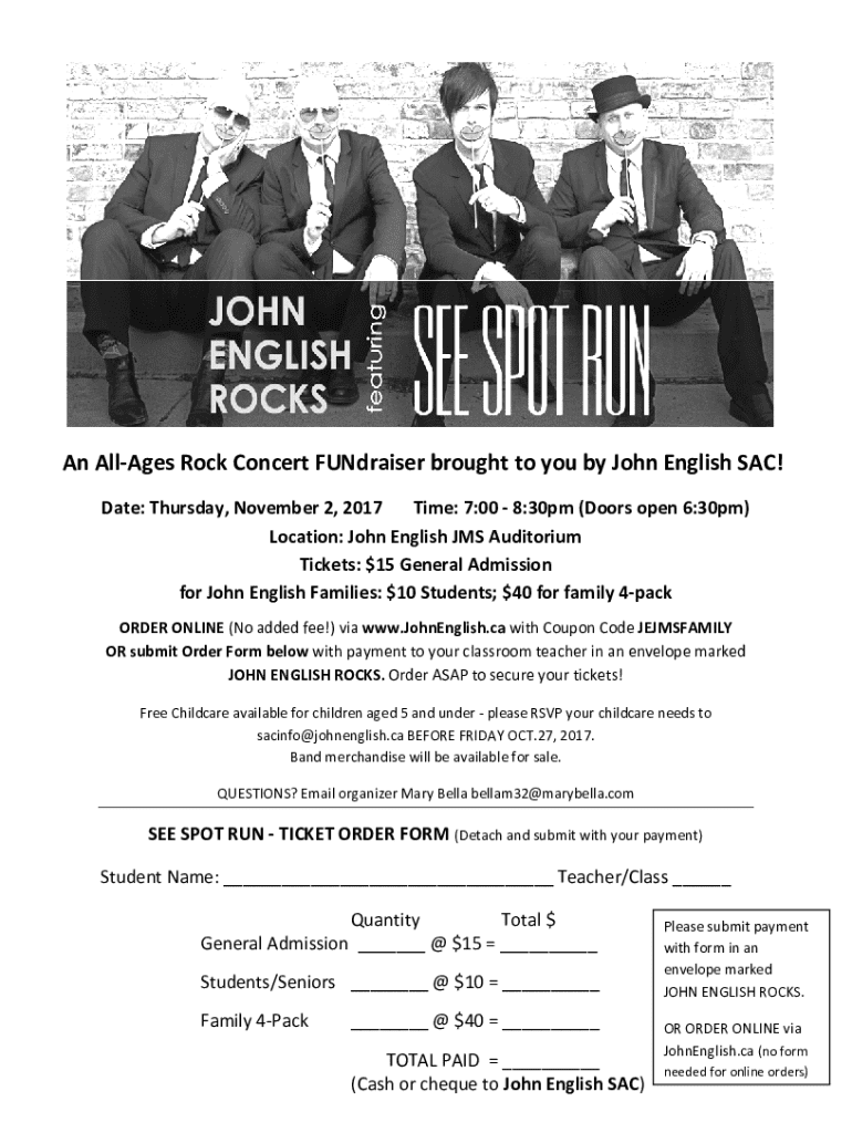 Join the All-Ages Rock Concert FUNdraiser on November 2, 2017. Enjoy great music, family-friendly atmosphere, and support John English SAC!