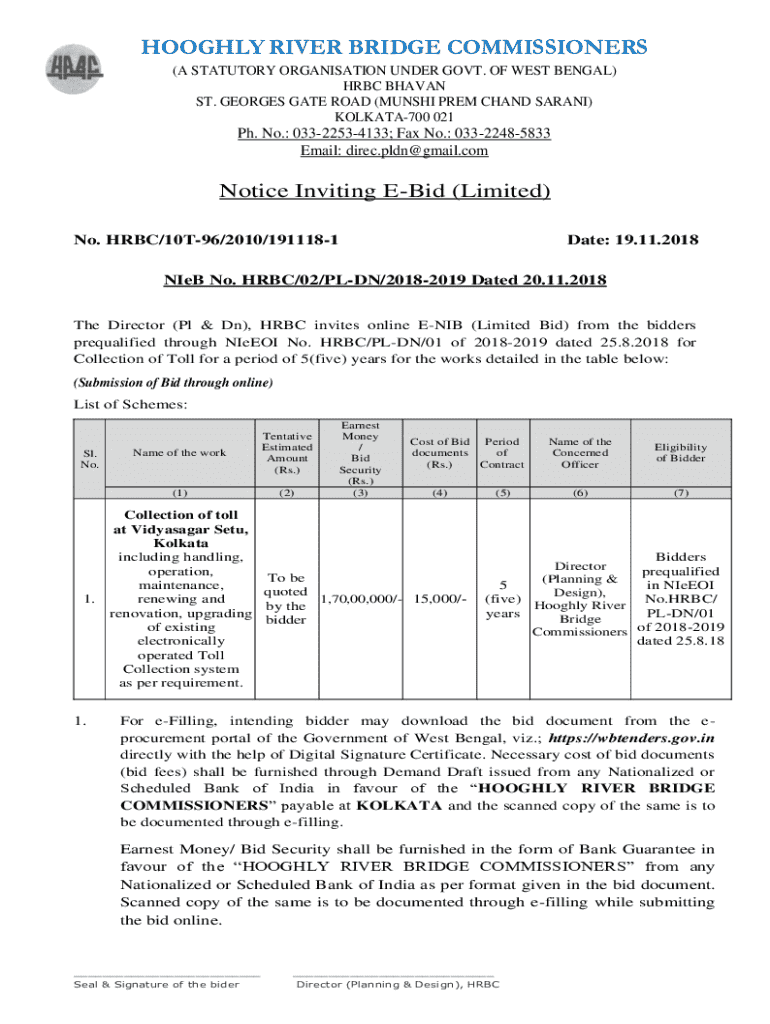 This document invites limited bids for toll collection at Vidyasagar Setu, Kolkata, for a duration of five years, detailing submission requirements and schedules.