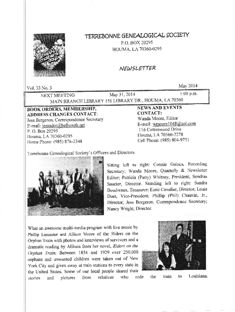 Members of the Terrebonne Genealogical Society and contributors to its initiatives may be required to file the newsletter to share information and updates with the community.