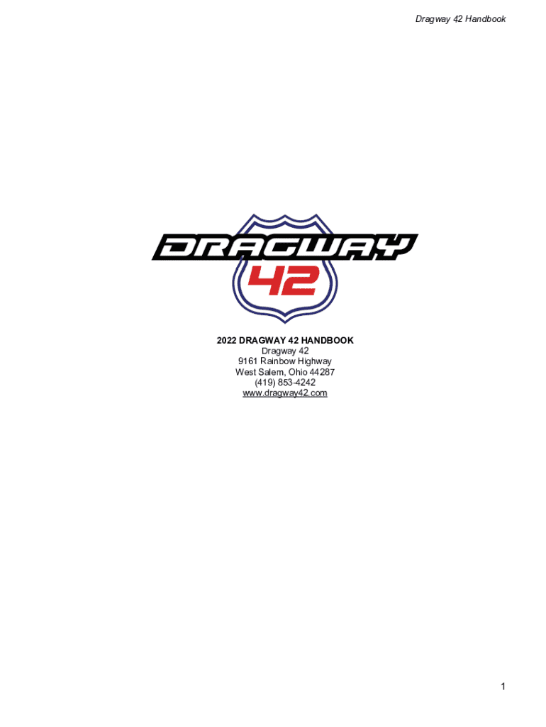 Dragway 42 Handbook2022 DRAGWAY 42 HANDBOOK Dragway 42 9161 Rainbow Highway West Salem, Ohio 44287 (419) 8534242 www.dragway42.com1Dragway 42 HandbookDragway 42s Staff and Management welcomes you!