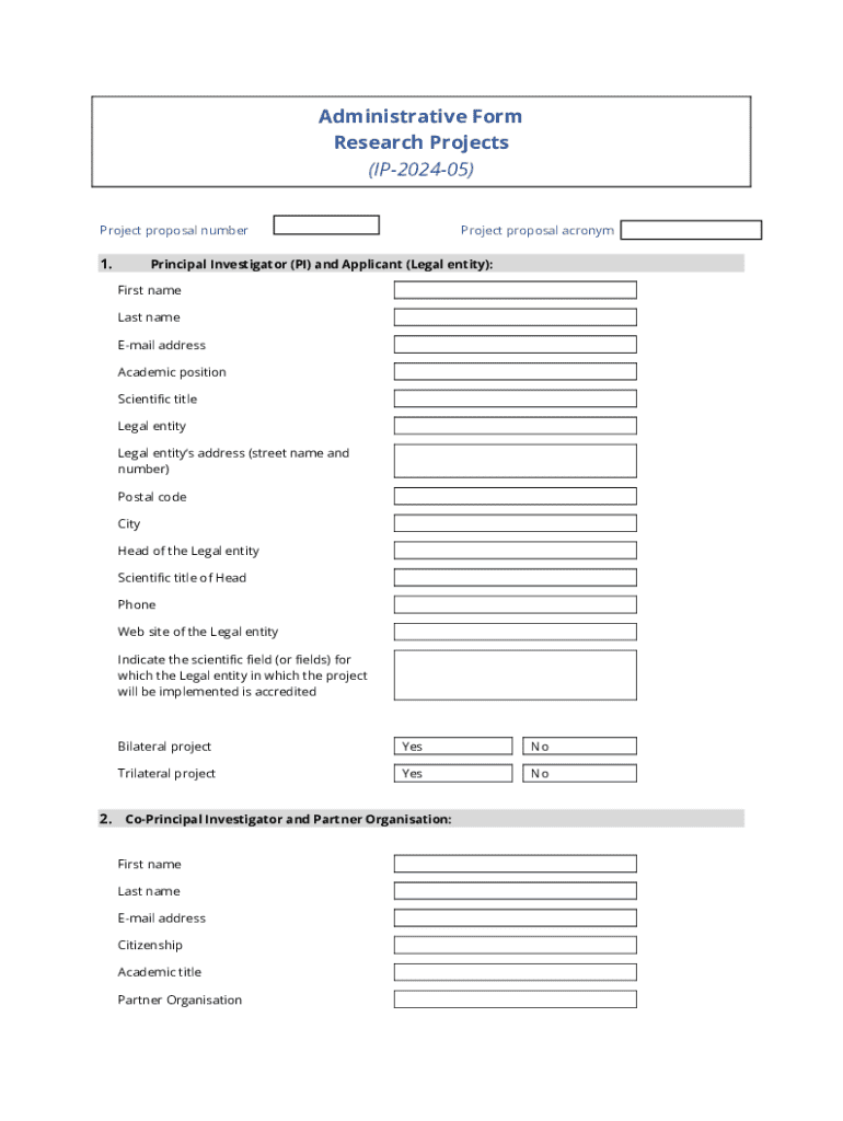 Administrative Form Research Projects (IP202405) Project proposal number1. Project proposal acronymPrincipal Investigator (PI) and Applicant (Legal entity): First name Last name Email address Academic