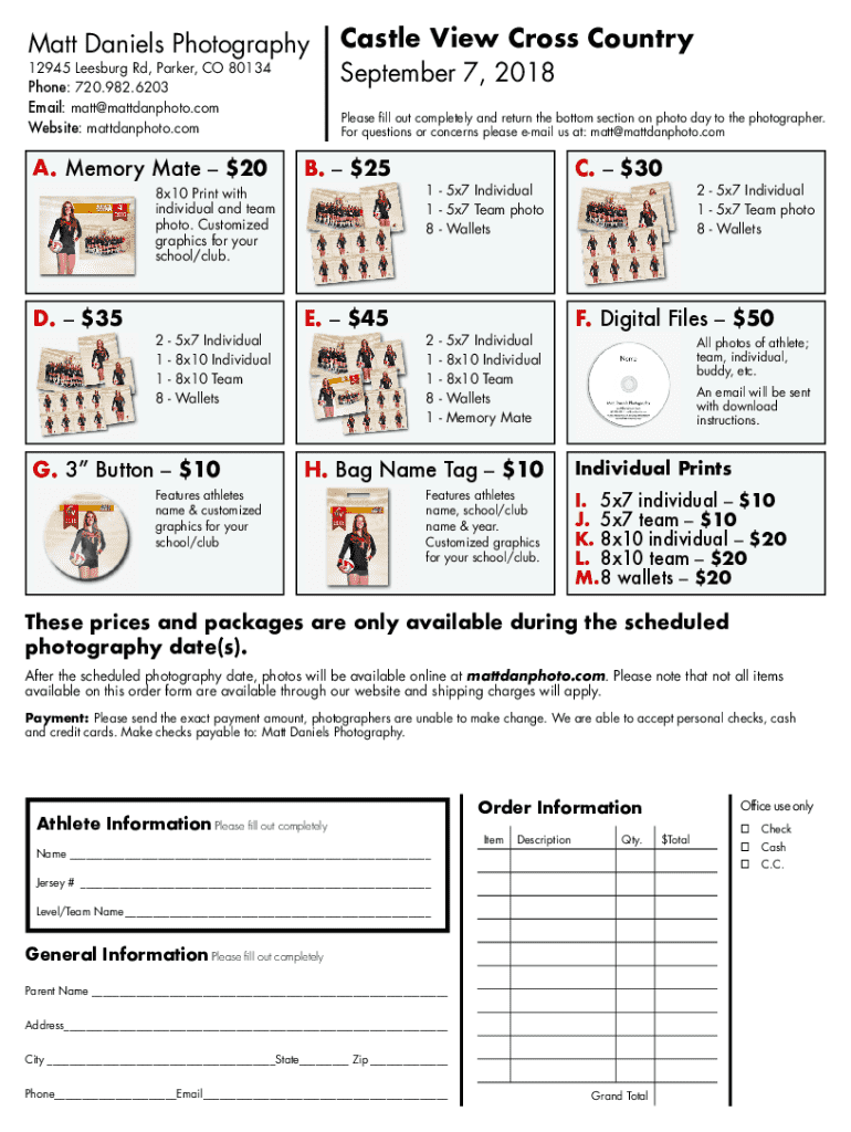 Matt Daniels Photography 12945 Leesburg Rd, Parker, CO 80134 Phone: 720.982.6203 Email: matt@mattdanphoto.com Website: mattdanphoto.comCastle View Cross Country September 7, 2018 Please fill out completely