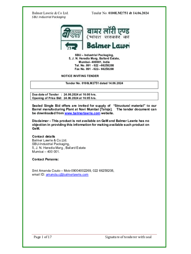 Balmer Lawrie & Co Ltd.Tender No. 0100LM2751 dt 14.06.2024SBU: Industrial PackagingSBU Industrial Packaging, 5, J. N. Heredia Marg, Ballard Estate, Mumbai 400001, India Tel. No. 091 022 66258208 Fax