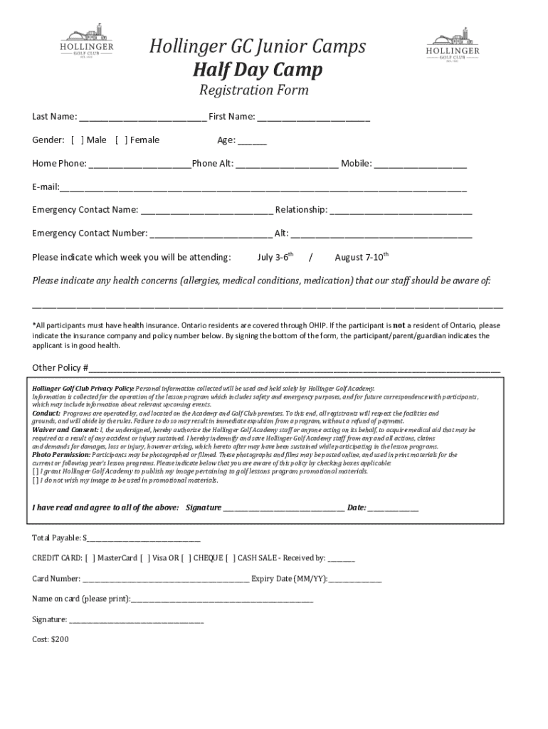 Bollinger GC Junior Camps Half Day Camp Registration Format Name: ___ First Name: ___ Gender: [ ] Male [ ] Females: ___Home Phone: ___Phone Alt: ___ Mobile: ___ Email:___ Emergency Contact Name: ___