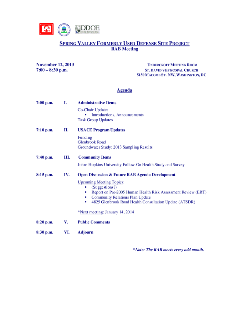 SPRING VALLEY FORMERLY USED DEFENSE SITE PROJECT RAB Meeting November 12, 2013 7:00 8:30 p.m.UNDERCROFT MEETING ROOM ST. DAVIDS EPISCOPAL CHURCH 5150 MACOMB ST. NW, WASHINGTON, DCAgenda 7:00 p.m.I.Administrative Items CoChair Updates Introductions, Announcements Task Group Updates7:10 p.m.II.USACE Program Updates Funding Glenbrook Road Groundwater Study: 2013 Sampling Results7:40 p.m.III.Community Items Johns Hopkins University FollowOn Health Study and Survey8:15 p