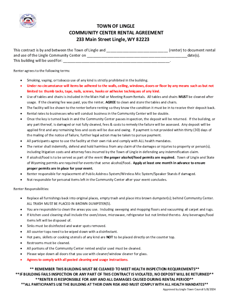 Secure your event at Lingle Community Center with our rental agreement. Review terms, responsibilities, and rental rates for a successful booking.