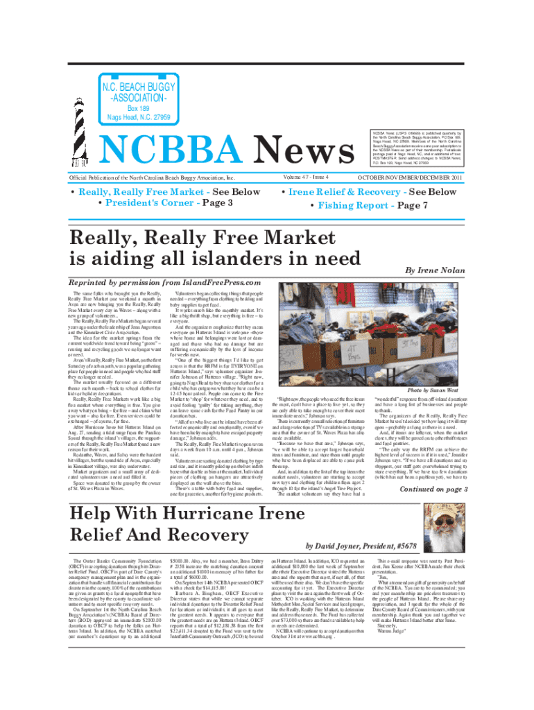N.C. BEACH BUGGY ASSOCIATIONBox 189 Nags Head, N.C. 27959NCBBA News Official Publication of the North Carolina Beach Buggy Association, Inc. Really, Really Free Market See Below President\'s Corner Page 3Volume 47 Issue 4NCBBA News (USPS 019689) is published quarterly by the North Carolina Beach Buggy Association, PO Box 189, Nags Head, NC 27959. Members of the North Carolina Beach Buggy Association receive a one year subscription to the NCBBA News as part of their membership