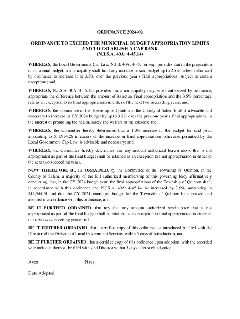 ORDINANCE 202402 ORDINANCE TO EXCEED THE MUNICIPAL BUDGET APPROPRIATION LIMITS AND TO ESTABLISH A CAP BANK (N.J.S.A. 40A: 445.14) WHEREAS, the Local Government Cap Law, N.J.S. 40A: 445.1 et seq.,