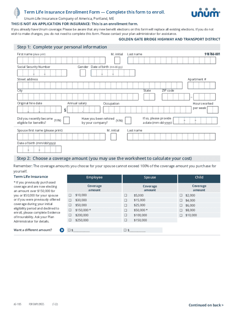 Term Life Insurance Enrollment Form Complete this form to enroll. Unum Life Insurance Company of America, Portland, ME THIS IS NOT AN APPLICATION FOR INSURANCE: This is an enrollment form. If you