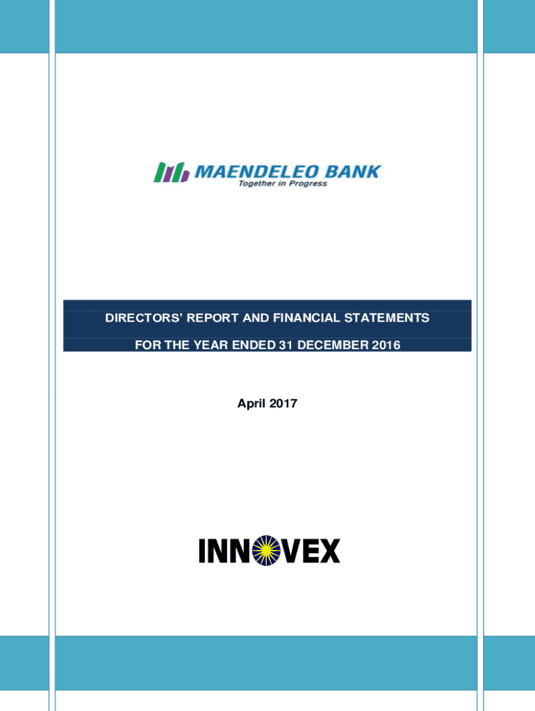 DIRECTORS REPORT AND FINANCIAL STATEMENTS FOR THE YEAR ENDED 31 DECEMBER 2016April 2017INN VEXINNOVEX 20141|PageMAENDELEO BANK PLC FINANCIAL STATEMENTS FOR THE YEAR ENDED 31 DECEMBER 2016 TABLE OF CONTENTS Company information Board of Directors` reportPage No. 12 317Statement of Directors` responsibilities18Declaration of Head of Finance19Independent auditor`s report to the members of Maendeleo Bank Plc2026Financial statements Statement of financial position27Statement