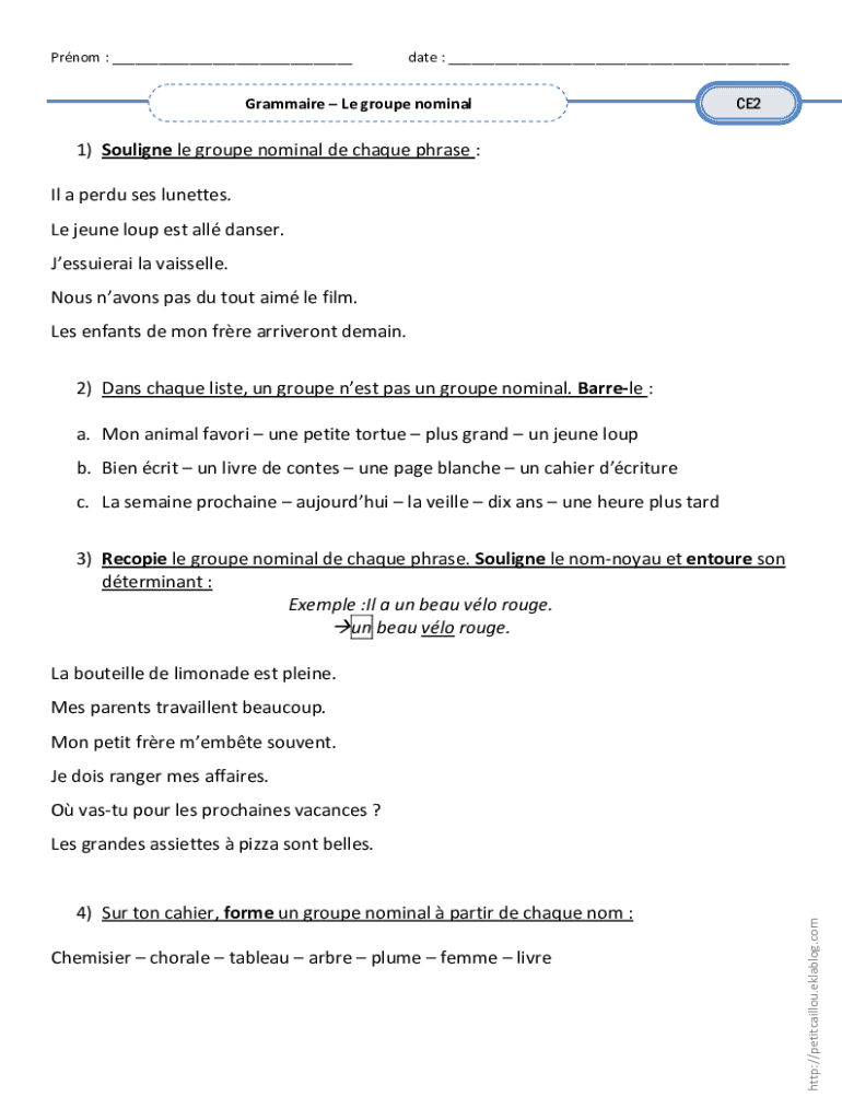 Prom : ___date : ___Grammar Le group nominalCE21) Soigne LE group nominal de claque phrase :