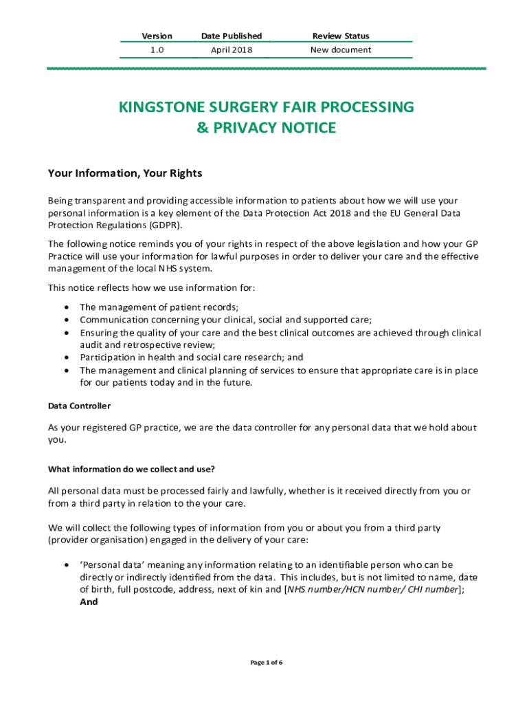 Healthcare providers and organizations involved in the administration of Kingstone surgery are required to file fair processing to ensure compliance with information governance regulations.