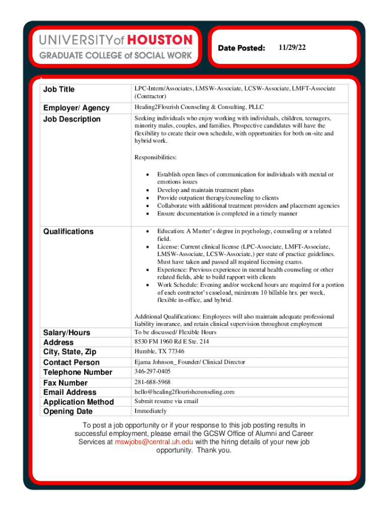 11/29/22Job TitleLPCIntern/Associates, LMSWAssociate, LCSWAssociate, LMFTAssociate (Contractor)Employer/ Agency Job DescriptionHealing2Flourish Counseling & Consulting, PLLC Seeking individuals who