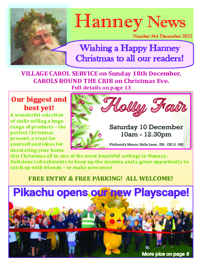 Hanney News Number 564 December 2022Wishing a Happy Hanney Christmas to all our readers! VILLAGE CAROL SERVICE on Sunday 18th December, CAROLS ROUND THE CRIB on Christmas Eve. Full details on page