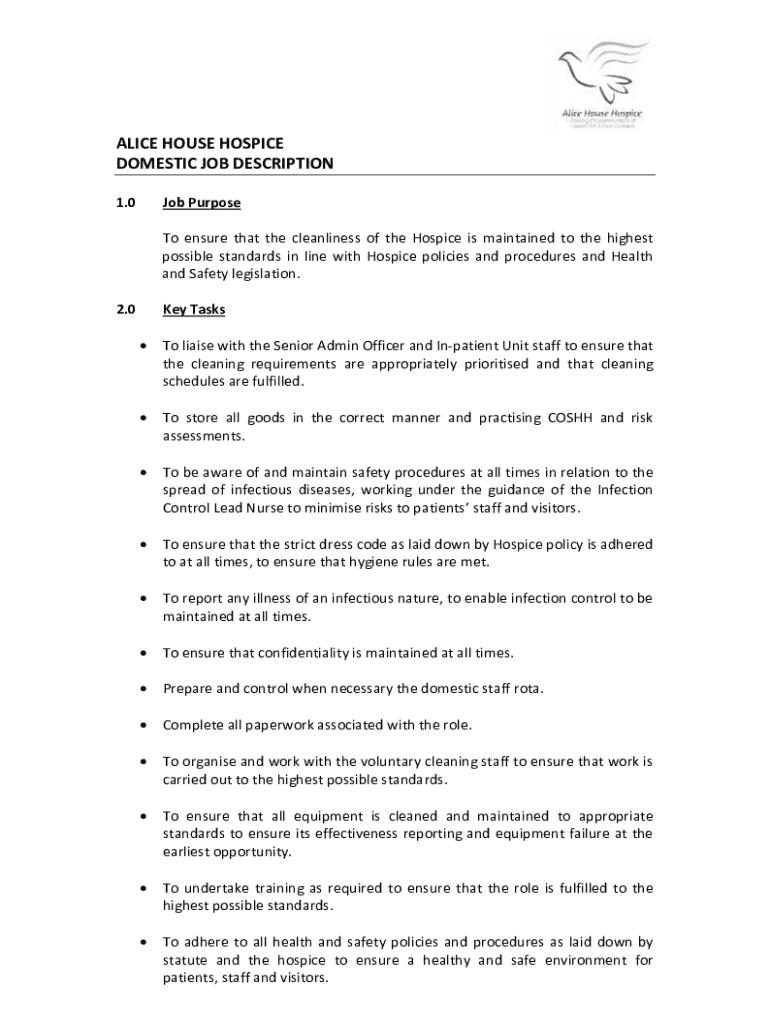 A domestic job description outlines the roles, responsibilities, and expectations for individuals employed in household positions, such as nannies, housekeepers, or caregivers.