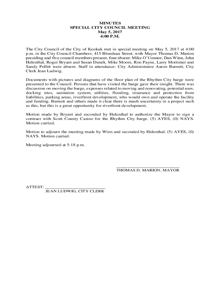 MINUTES SPECIAL CITY COUNCIL MEETING May 5, 2017 4:00 P.M.The City Council of the City of Keokuk met in special meeting on May 5, 2017 at 4:00 p.m. in the City Council Chambers, 415 Blondeau Street,