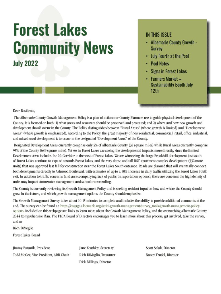 Forest Lakes Community News July 2022IN THIS ISSUE Albemarle County Growth Survey July Fourth at the Pool Notes Signs in Forest Lakes Farmers Market Sustainability Booth July 12thDear Residents, The