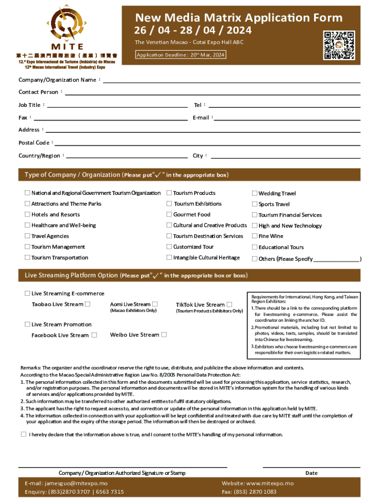 Apply for the New Media Matrix event in Macao, from April 26-28, 2024. Secure your place for innovative tourism promotion and live streaming opportunities.