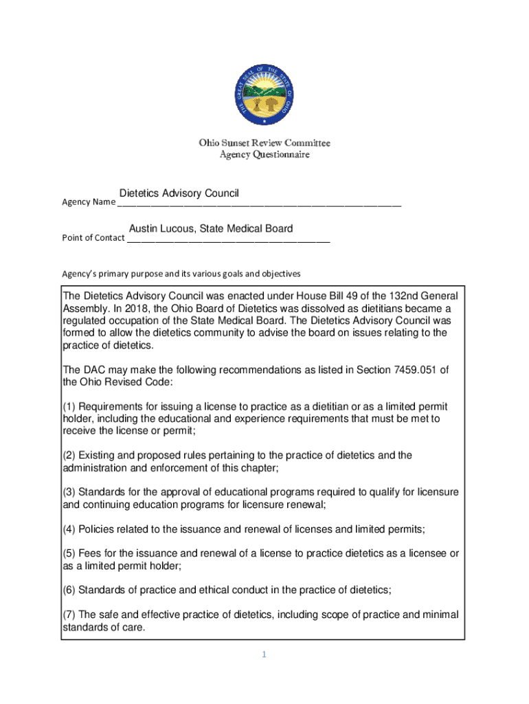 Agency QuestionnaireDietetics Advisory CouncilAgency Name ___Austin Lucius, State Medical Boarding of Contact ___Agencies primary purpose and its various goals and objectives