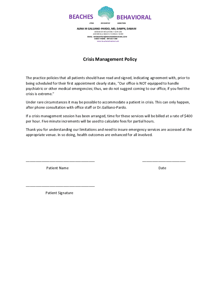 Get the free Beaches Behavioral Psychiatry Crisis Management Policy