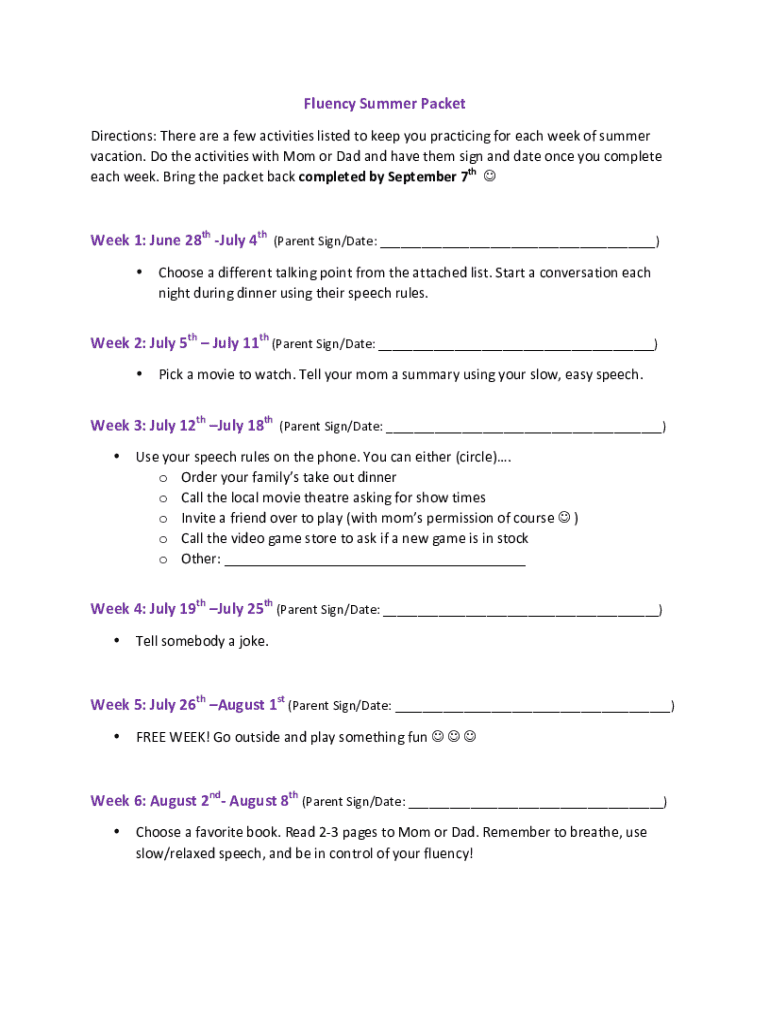 To fill out the fluency summer packet, students should complete all assigned exercises, provide necessary personal information, and submit any required reflections or feedback as guided by the instructions.
