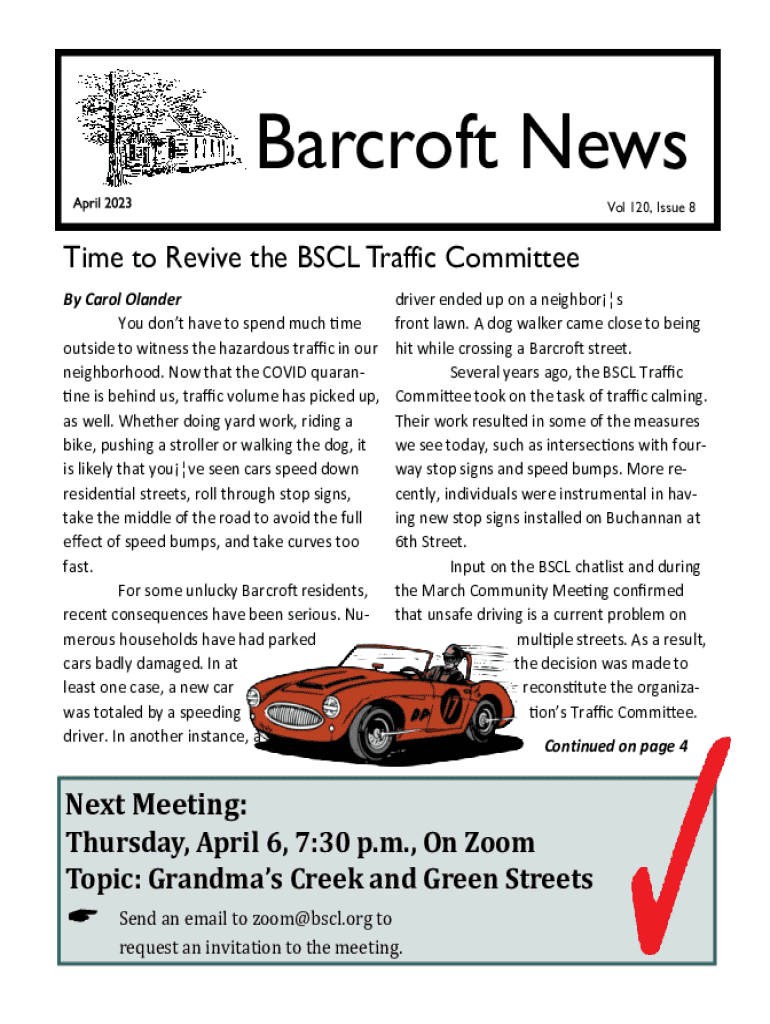 This issue discusses traffic safety concerns in Barcroft, the revival of the BSCL Traffic Committee, and the upcoming community engagement opportunities. Sign up to assist!