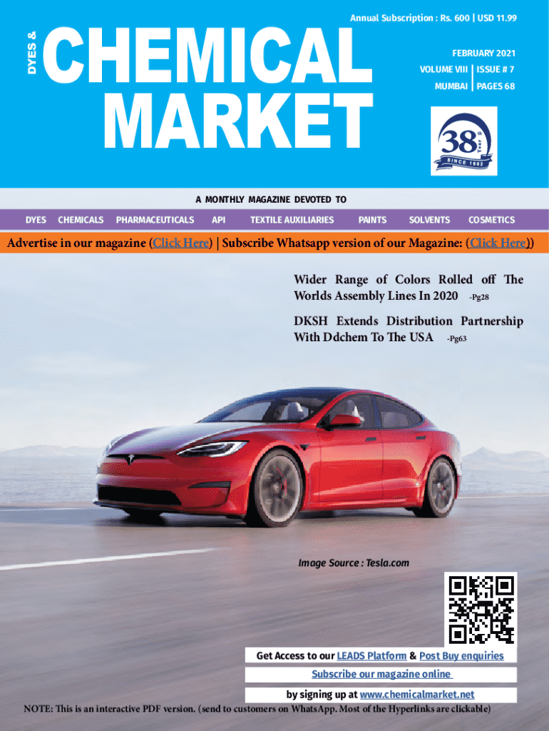 CHEMICAL MARKETS annual Subscription : Rs. 600 | USD 11.99 FEBRUARY 2021 VOLUME VIII ISSUE # 7 MUMBAI PAGES 68A MONTHLY MAGAZINE DEVOTED TO DYESCHEMICALSPHARMACEUTICALSAPITEXTILE AUXILIARIESPAINTSSOLVENTSCOSMETICSAdvertise