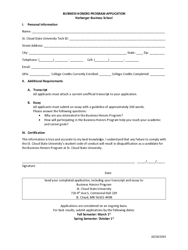 BUSINESS HONORS PROGRAM APPLICATION Herberger Business School I.Personal InformationName: ___ St. Cloud State University Tech ID: ___ Street Address: ___ City: ___ State: ___ Zip: ___ Telephone: (___)