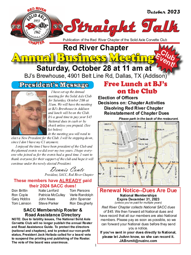 Join the Solid Axle Corvette Club\'s Red River Chapter for the Annual Business Meeting on October 28, 2023, at BJ\'s Brew house in Dallas. Free lunch provided!