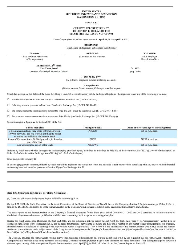 BiomX Inc. reports the dismissal of Brightman Almagor Zohar & Co. and the appointment of Kesselman & Kesselman as auditors, effective April 29, 2021.
