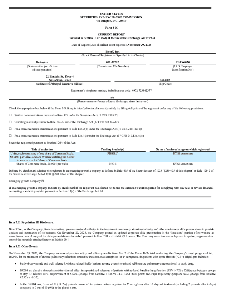 Biome Inc. announces positive safety and efficacy results for BX004 in treating chronic Pseudocodes aeruginosa infections in cystic fibrosis patients. Updated report dated November 29, 2023.