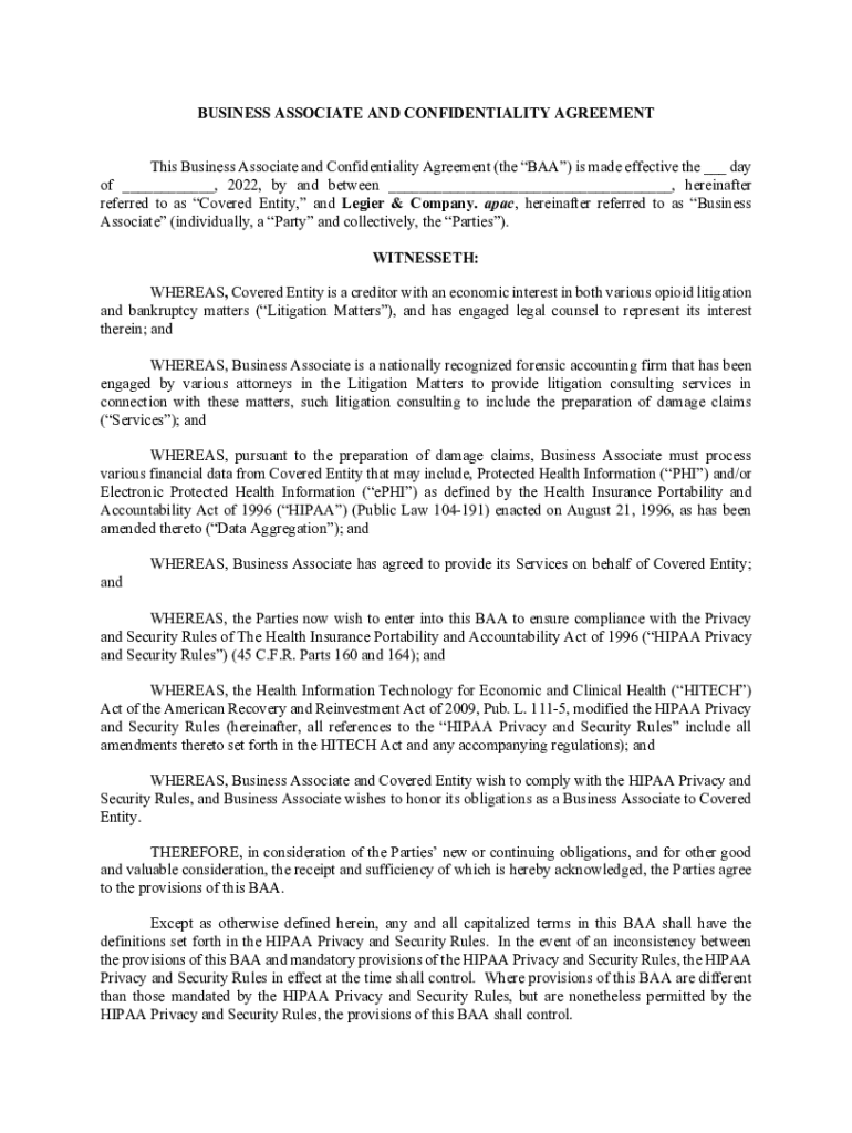 This agreement outlines the obligations of Business Associates in handling PHI, ensuring compliance with HIPAA Privacy and Security Rules while providing essential services.