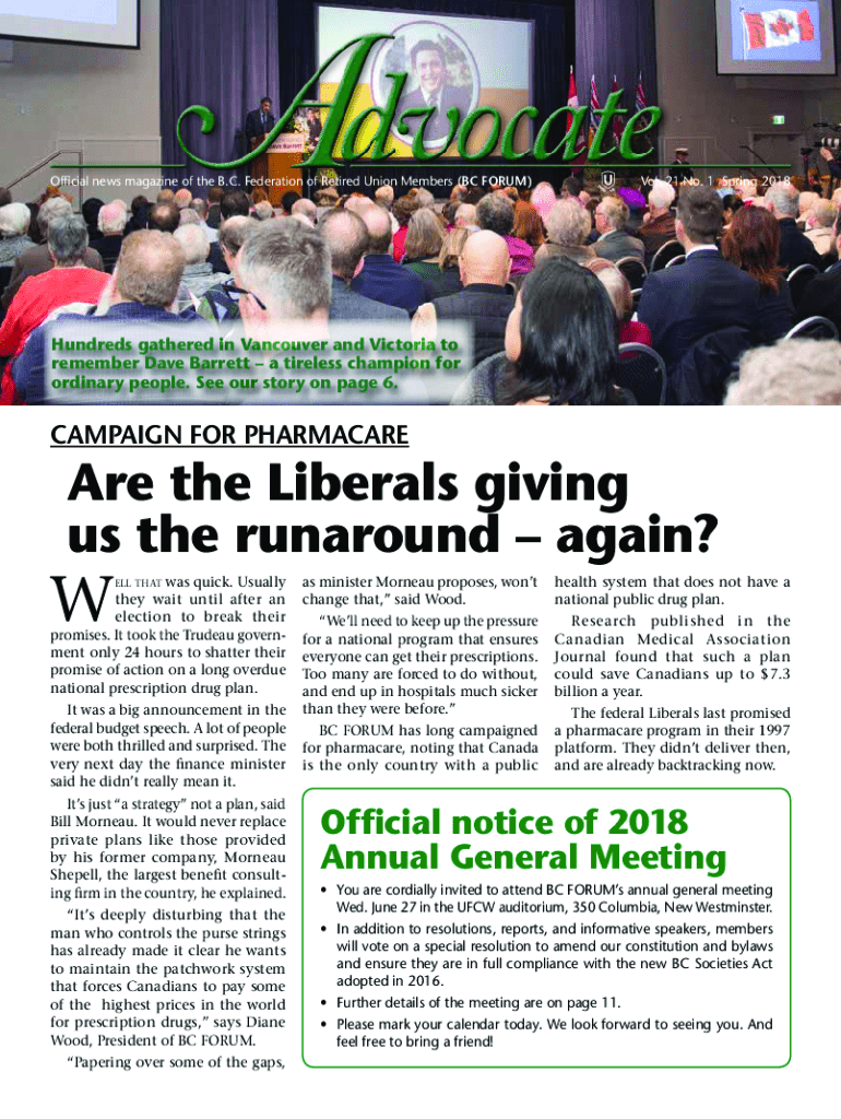 Stay informed with the Spring 2018 issue of The Advocate, the official magazine of BC FORUM, featuring updates on pharmacies, public health, and member benefits.