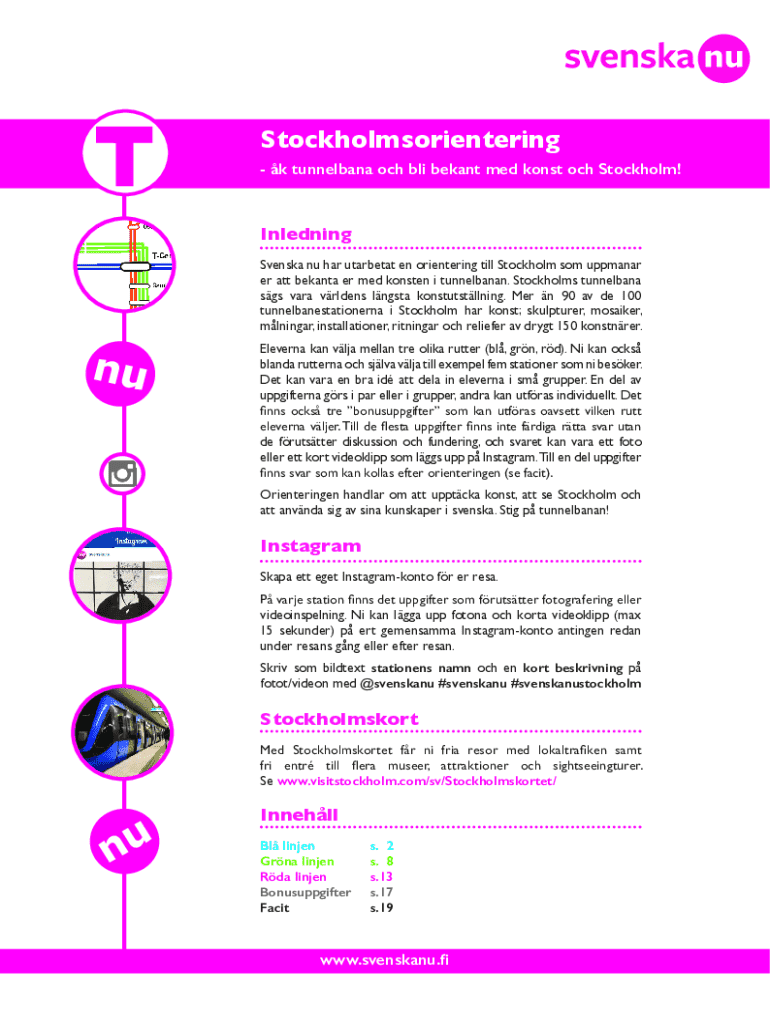 Stockholmsorientering k tunnelbana och bli bekant med konst och Stockholm!Inledning Svenska nu har utarbetat en orientering till Stockholm som uppmanar er att bekanta er med konsten i tunnelbanan.